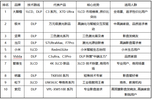 2、极米:DLP投影绝对领军者,以MAVII鹰眼感知系统、0.8秒开机等技术优势,稳居中高端市场头把交椅,用户复购率达32%。