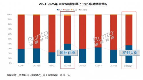 根据洛图科技(RUNTO)2025年Q3及双11数据显示,当下投影行业“技术阵营分化”趋势显著,头部品牌优势持续扩大,1LCD与DLP市场份额占据超9成:
