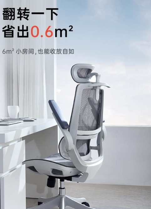 其 3D 扶手支持 90° 向上翻转,椅体可完全推进桌下,实际可节省约 0.6㎡ 的使用空间,显著改善小房间通道受限的问题。在支撑结构上,M59AS 并未因体积压缩而牺牲功能: