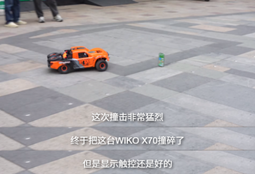 在实验室测试中,WIKO X70 的表现已属行业领先。为了模拟日常摔机的随机性,测试者还将手机带到室外,邀请路人进行“随手摔”测试,结果依旧没碎。直到用 RC 赛车进行多次高速冲撞,屏幕才最终出现损伤——而此时,手机所有功能仍可正常使用。