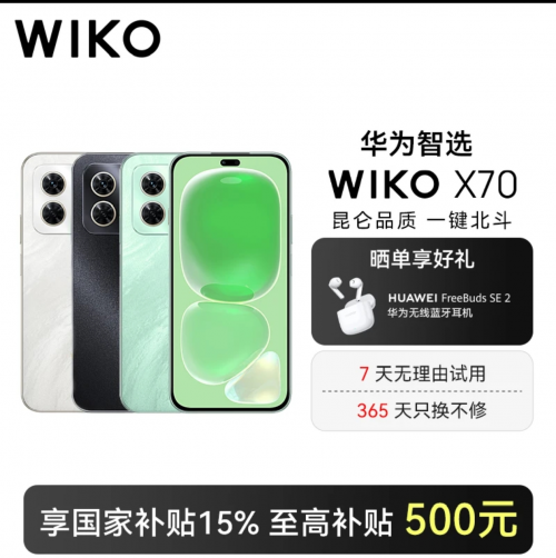 现在购买 WIKO X70,可享多重新店开业限时福利,包括至高500元以旧换新补贴、额外优享权益礼包等,部分地区还可叠加消费补贴,实现更优入手价。晒单还有机会获赠华为无线蓝牙耳机。此外,品牌提供“365天只换不修”售后保障,为用户再添一重安心。