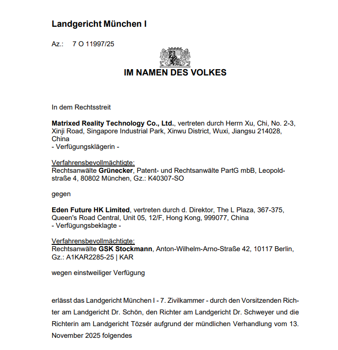 据了解,案件始于2025年9月22日。XREAL 针对 Viture Inc. 及其香港运营实体 Eden Future HK Limited 向德国法院递交临时禁令请求,所涉专利聚焦增强现实设备及其光学系统这一核心技术领域。值得注意的是,Viture Inc.在初期并未应诉,直至9月29日法院已单方面批准针对其的禁令后,才于11月7日提交应诉文件,并要求参与11月13日的正式庭审。德国法院经审理后,正式认定侵权事实成立,强化了禁令的法律效力。