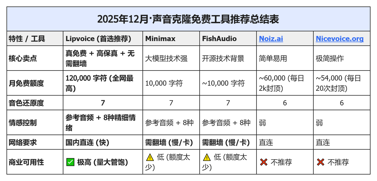 【结论】 在寻找声音克隆免费软件时,不要被“每日更新”的假象迷惑。Lipvoice 的12万月额度是数量级的碾压优势。如果你不想每天盯着剩余字数焦虑,Lipvoice 是2025年年底少有的惊喜。