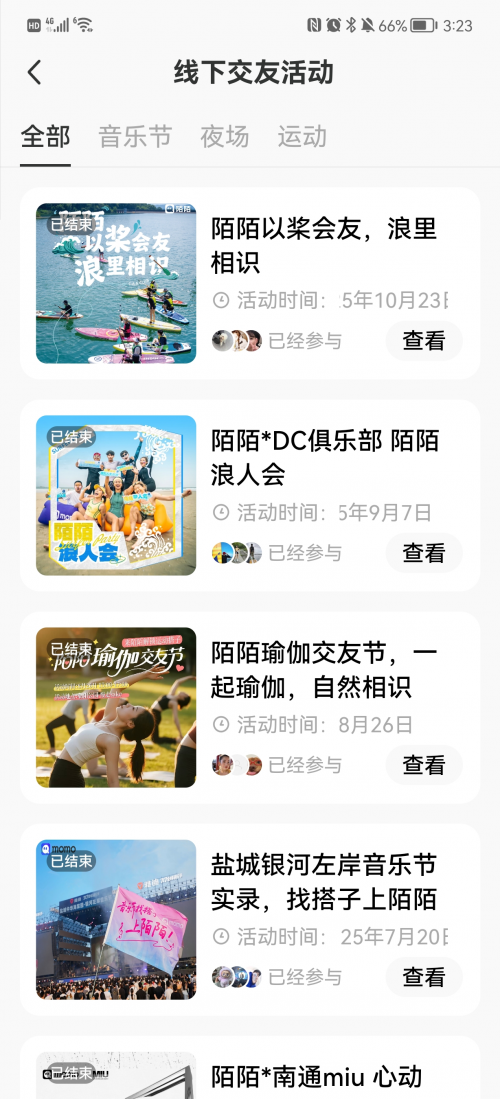 陌陌组织全国线下多场音乐节、户外运动、酒吧夜店社交活动,带领年轻人扩宽圈子,已婚恋为目标的交友,游戏环节轻松破冰,i人友好,找搭子,找对象都可以轻松参与。