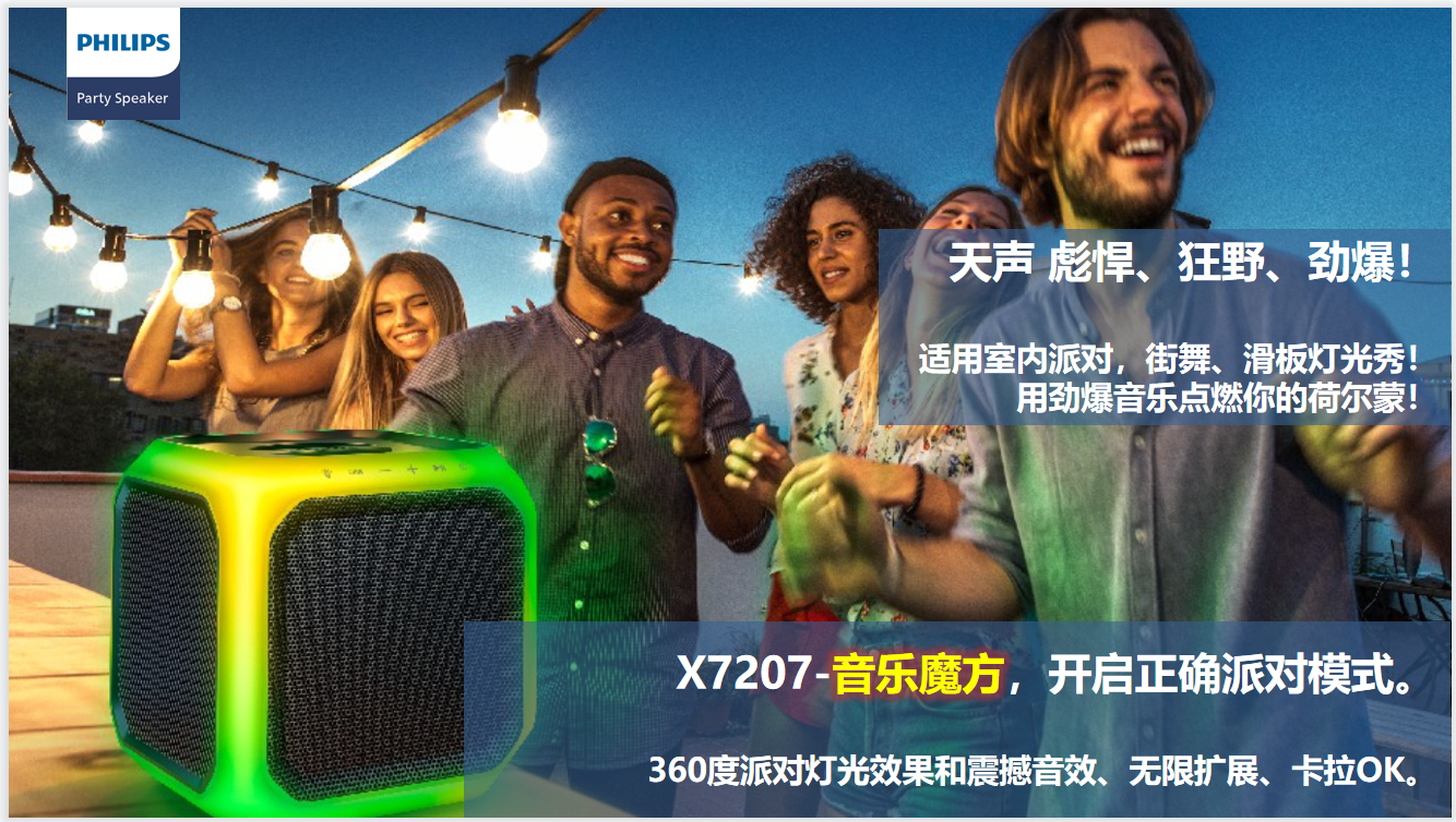 盛夏狂欢,开启派对新模式。近日飞利浦影音新品”音乐魔方“X7207派对音箱震撼上市。品牌百年,历久弥新。飞利浦X7207尽情释放光影魅力燃爆潮流圈,带着天声彪悍、狂野、劲爆的气质刷新户外派对音响热潮。