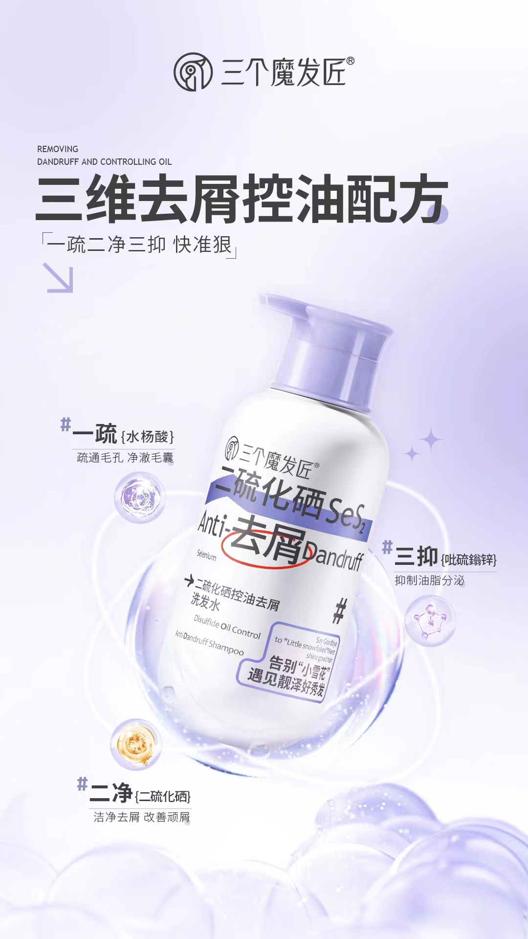 三个魔发匠新品二硫化硒控油去屑洗发水,能够有效改善因熬夜,高脂,高糖等良饮食习惯导致的头皮屑增多,头油,头皮发痒问题。
